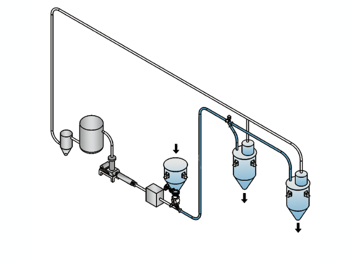 正压稀相闭环气力输送是利用正压气体对物料进行输送,压送式气体带动物料在管道内运输,完成一次输送过程之后,将原本要排入大气的尾气引入到进气口,循环利用,从而形成闭环气力输送系统。
