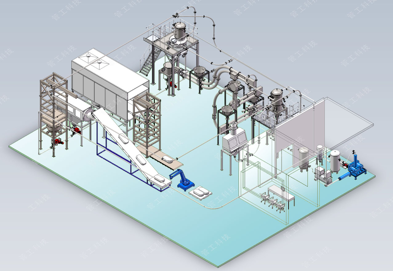 粉体物料自动化处理系统是包含从原料拆袋解包、气力输送、原料仓储、计量配料、自动化投料等一系列机械设备的一站式的自动化处理系统,一般由自动化拆包机、气力输送系统、管链输送系统、计量称重系统、配料混合系统、多点定量投料系统等组成。
